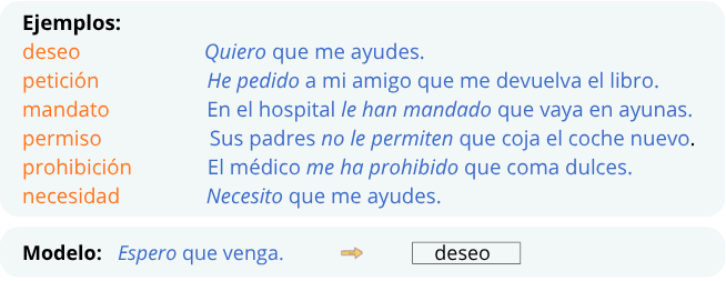 Identifica si los verbos en cursiva (que funcionan con subjuntivo) indican alguno de los siguientes valores: